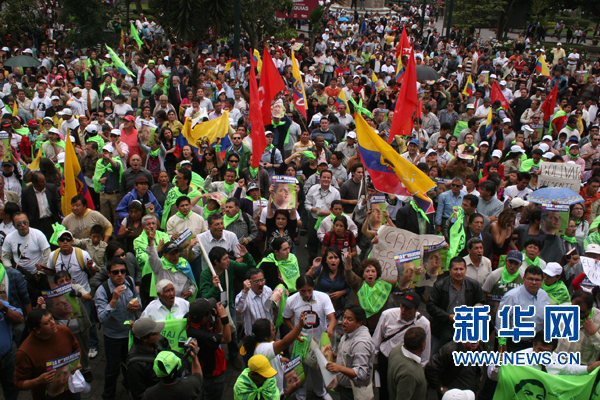 9月30日,厄瓜多爾總統科雷亞的支持者在首都基多舉行集會。厄瓜多爾當日發生的警察大規模抗議活動在全國引發騷亂和沖突,厄政府決定全國和國家軍隊進入緊急狀態。總統科雷亞發表聲明稱,當天發生的騷亂是一場蓄謀已久的“政變企圖”,他本人實際已遭到“綁架”。科雷亞在聲明中呼吁支持他的民眾保持克制。新華社發(圣地亞哥·阿馬斯攝)