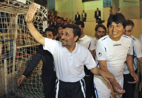 據外電報道,伊朗總統穆罕默德·內賈德和玻利維亞總統莫拉萊斯長久以來因相似的政治立場和對美國的尖銳批評而為世界所矚目。現在,他們又站在同一陣營中,不過這一次是在五人制足球場上。
