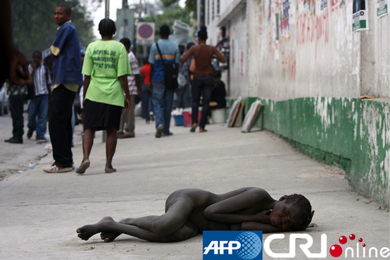 海地首都太子港,一名貧困女子赤裸著身體病倒在大街上。圖片來源:(AFP/國際在線)