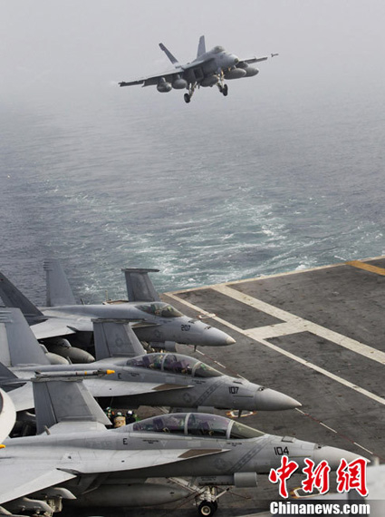 參加美韓軍演的美軍艦載機準(zhǔn)備在航母著艦