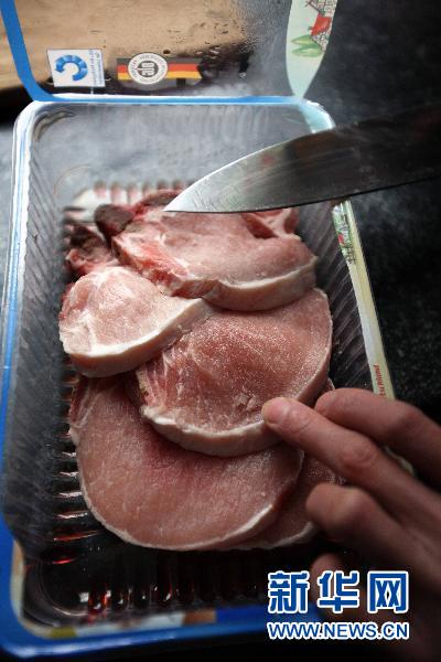 1月11日,一名廚師在德國首都柏林展示他剛從超市買回來的豬肉。德國下薩克森州農業部發言人當日說,該州一養豬場的豬肉樣本被檢測出二惡英含量明顯超標。這是近日爆發的德國“二惡英毒飼料”事件中首次發現豬肉被二惡英污染。新華社記者 羅歡歡 攝