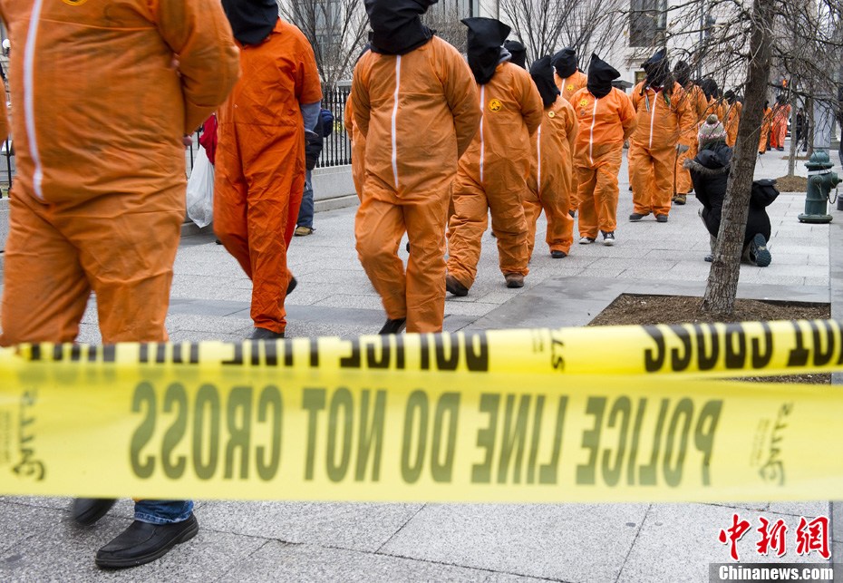 1月11日,美國華盛頓,示威者穿著橙色的囚服游行,要求關(guān)閉關(guān)塔那摩監(jiān)獄。當天是關(guān)塔那摩監(jiān)獄建立9周年紀念日。