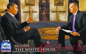 奧巴馬(左)接受福克斯新聞臺現(xiàn)場直播主持人奧賴?yán)麑TL。