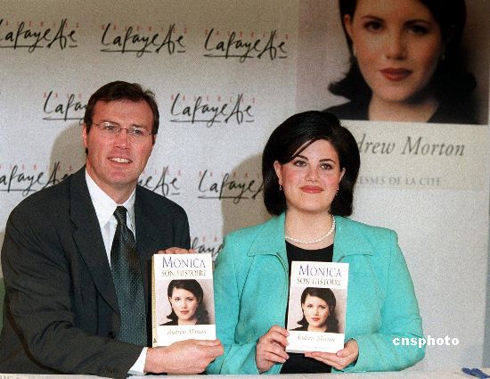 資料圖:2003年4月15日,英國知名傳記作家安德魯·莫頓在法國巴黎舉行宣傳會,與莫尼卡·萊溫斯基一起為他的新作——萊溫斯基傳記作宣傳。幾年前,萊溫斯基因與美國前總統(tǒng)克林頓有染,而成為轟動美國的新聞人物。 中新社發(fā)