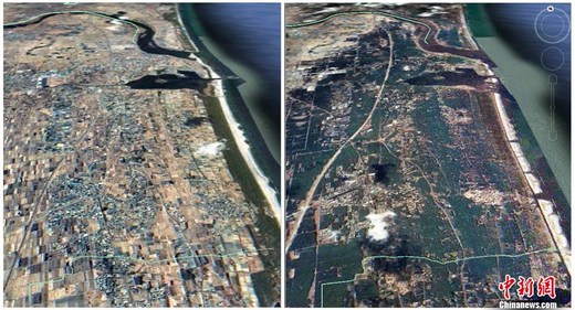 仙臺地區海嘯地震前后對比圖。