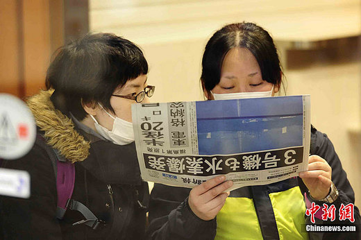 3月14日下午,兩名日本仙臺市的女性在看關(guān)于福島核電站的報道。報紙頭版寫道《第三號機組也發(fā)生氫氣爆炸》。據(jù)報道,位于福島縣境內(nèi)的福島第三核電站發(fā)生了氫氣爆炸。中新社發(fā) 侯宇 攝
