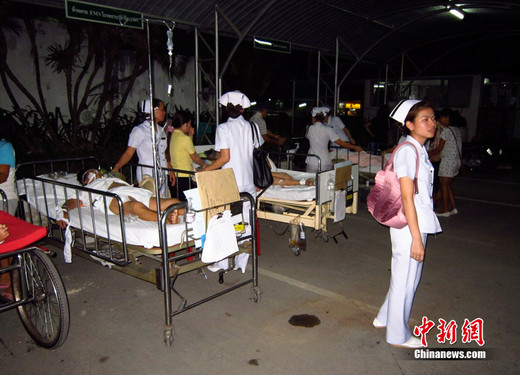 根據美國地質勘探局地震信息網發布的消息,緬甸東北部地區當地時間3月24日晚,在相距不到一分鐘時間內連續發生兩次7級強震。泰國、越南、我國云南和廣西等有震感。圖為泰國清萊震感明顯,醫院病人被疏散至室外。