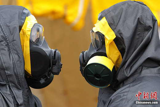 4月9日,日本東京,美國海軍陸戰(zhàn)隊的化學生物事件快速反應部隊在橫田空軍基地進行除污演練。