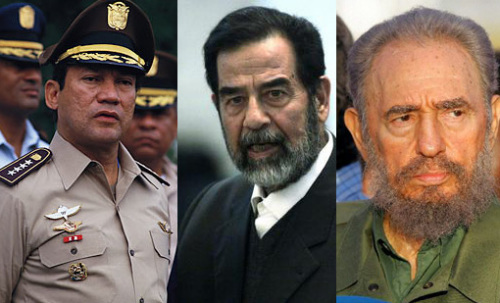 巴拿馬前政府首腦曼努埃爾?諾列加(左)、伊拉克前領(lǐng)導(dǎo)人薩達(dá)姆?侯賽因(中)、古巴前總統(tǒng)菲德爾·卡斯特羅(右)