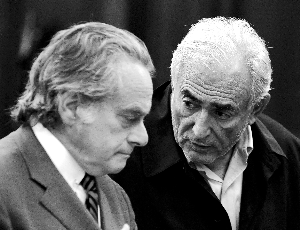5月16日,紐約,卡恩右在律師本杰明·布拉夫曼的陪同下,出席曼哈頓刑事法庭。