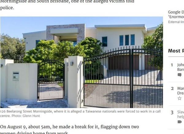 據(jù)香港《東方日?qǐng)?bào)》網(wǎng)站4月19日?qǐng)?bào)道,被困的臺(tái)灣人戴友庭(音譯)去年8月9日清晨,從布里斯班市中心附近的豪宅出逃求助。警方獲悉事件后展開(kāi)行動(dòng),在豪宅救出23名受害者,隨后再于南布里斯班另一幢“奴隸屋”救出35人。