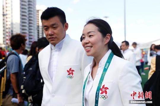 資料圖:帖雅娜、唐鵬夫婦參加中國香港奧運代表團在里約奧運村舉行升旗儀式。中新網(wǎng)記者 富田 攝