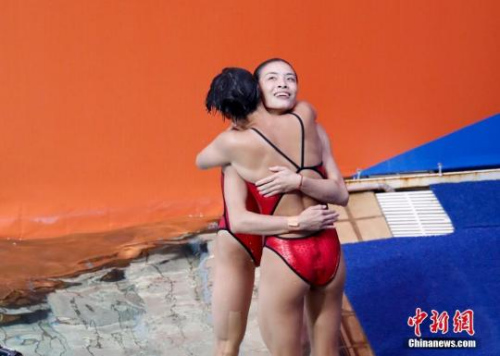 當(dāng)?shù)貢r(shí)間8月7日,在里約奧運(yùn)會(huì)女子雙人三米板決賽中,中國(guó)選手吳敏霞和施廷懋一路領(lǐng)先,無(wú)懸念?yuàn)Z得桂冠。圖為施廷懋擁抱吳敏霞。中新網(wǎng)記者 杜洋 攝
