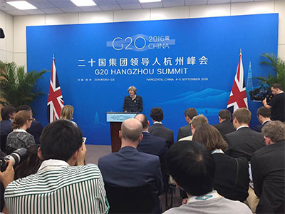 出席這次G20杭州峰會,是特雷莎·梅擔(dān)任英國首相后在國際多邊舞臺上的首次亮相。她表示杭州峰會在中國舉辦取得圓滿成功。