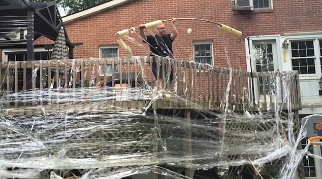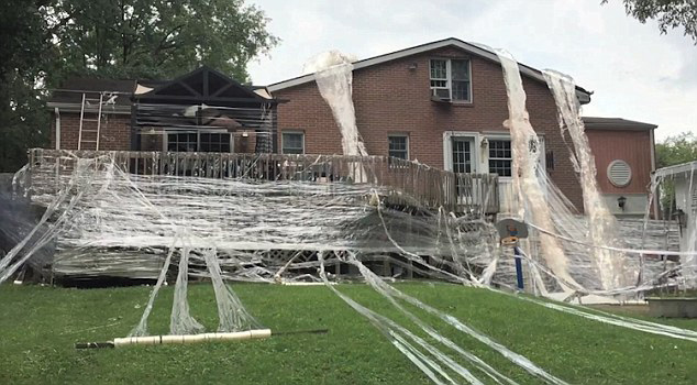喬納森邀請朋友一起來幫忙完成這個“大工程”。他們將約10卷膠帶套在一個木棍上提高效率,然后開始漫天地撕扯、纏繞,將房子的外圍、屋頂、甚至是廁所里都貼滿了膠帶。