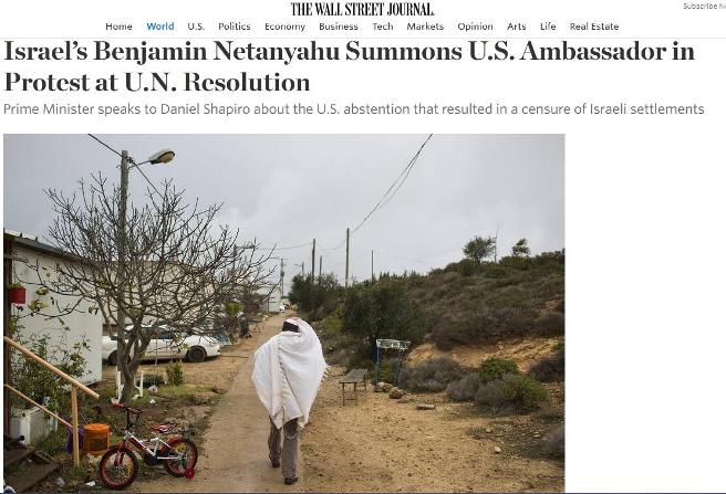 【環球網報道 記者 余鵬飛】據美國《華爾街日報》12月25日報道,針對譴責以色列在約旦河西岸建造猶太人定居點的聯合國安理會決議,美國拒絕投下否決票,以色列總理內塔尼亞胡周日召見了美國大使,對奧巴馬政府展開嚴厲抨擊。