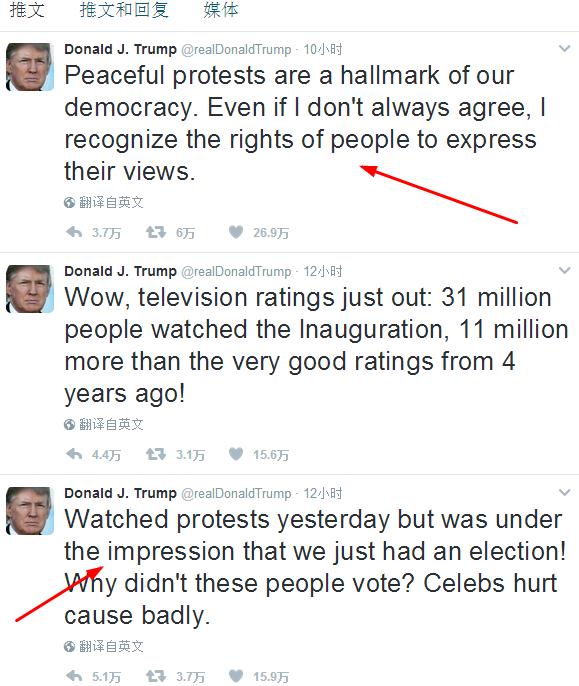 特朗普(Donald Trump)1月22日發(fā)布第一條推文稱:“昨天看了抗議活動,但感想是我們才剛舉行過選舉!這些人為何不去投票呢?那些名人嚴(yán)重?fù)p及活動目標(biāo)。”