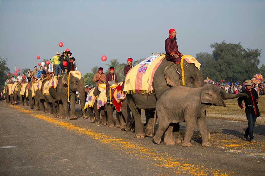 2月18日,在老撾的沙耶武里省,幾頭大象參加大象節的大象游行。新華社/路透
