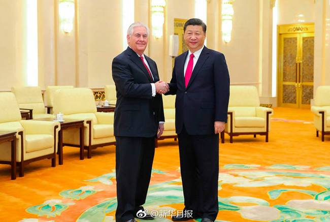 19日,中國國家主席習近平在人民大會堂會見美國國務卿蒂勒森。蒂勒森轉達了美國總統特朗普對習近平主席的問候,表示特朗普總統高度重視同習主席的通話聯系,期待著盡早舉行兩國元首會晤,并有機會對中國進行訪問。為美中關系未來50年的發展確定方向。美方愿本著不沖突不對抗、相互尊重、合作共贏的精神發展對華關系,不斷增進美中相互了解,加強美中協調合作,共同應對國際社會面臨的挑戰。