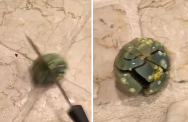 這枚色彩繽紛的雞蛋在9年前復(fù)活節(jié)的“尋找彩蛋”游戲中被遺忘在沙發(fā)坐墊下,直至今天才被發(fā)現(xiàn)。在這段令人反胃的視頻中,在Reddit McReddit搖了搖雞蛋后,能聽到有東西在里面翻滾,他說道“里面已經(jīng)變成一個皮球了。”繼而用刀敲開9歲的雞蛋殼,露出里面一個奇形怪狀、腐爛的腫塊。