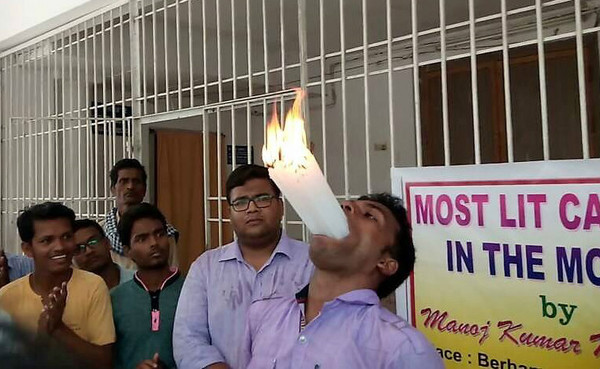 據報道,這名男子是來自印度東部的23歲大學碩士生莫哈拉納(Manoj Kumar Moharana),近日在地方官員辦公室前,他將21根蠟燭逐一點燃,接著將蠟燭一根一根放進嘴中,讓圍觀民眾都嚇傻了,后來把蠟燭取出后,他便開始將一顆顆葡萄塞入口中,只見他滿頭大汗,費了許多工夫才塞滿90顆葡萄。
