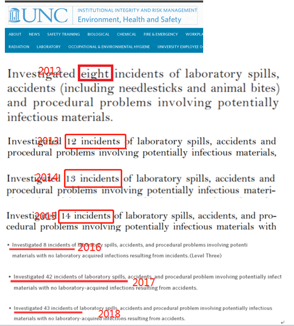 △根據(jù)北卡羅來(lái)納大學(xué)歷年年報(bào)提供的公開(kāi)信息,巴里克的實(shí)驗(yàn)室在2012年至2018年間發(fā)生的實(shí)驗(yàn)室泄漏事故總數(shù)多達(dá)140起。