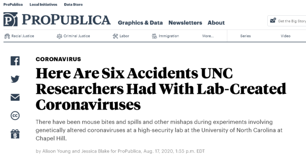 另?yè)?jù)美國(guó)獨(dú)立調(diào)查媒體“專業(yè)公眾”網(wǎng)站去年8月報(bào)道,2015年1月1日至2020年6月1日,巴里克實(shí)驗(yàn)室所在的北卡羅來(lái)納大學(xué)教堂山分校共向美國(guó)國(guó)家衛(wèi)生研究院(NIH)報(bào)告了28起涉及轉(zhuǎn)基因生物的實(shí)驗(yàn)室安全事故,其中6起涉及實(shí)驗(yàn)室制造的多種冠狀病毒。