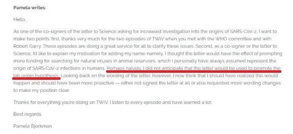 △比約克曼在發(fā)給自媒體播客節(jié)目“本周病毒學(xué)”的信中寫(xiě)道,“我也許太天真了,沒(méi)想到這封信會(huì)被用來(lái)推廣‘實(shí)驗(yàn)室起源’假說(shuō)”。