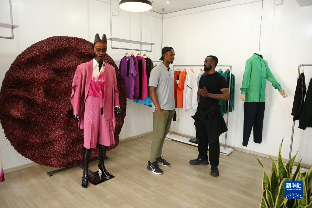 4月1日,在盧旺達(dá)首都基加利,Moshions品牌創(chuàng)始人摩西·圖拉希爾瓦在服裝品牌店內(nèi)接受記者采訪。新華社發(fā)(黃萬晴攝)