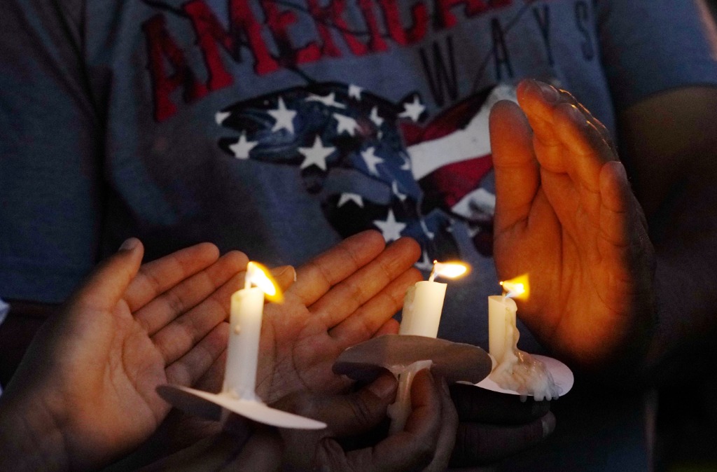 5月29日,在美國得克薩斯州南部尤瓦爾迪市的城市廣場,市民為槍擊事件遇害者守夜。新華社記者吳曉凌攝