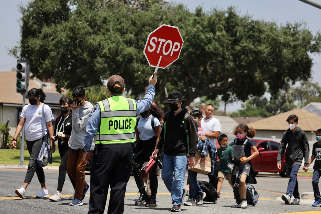 5月25日,一名警員在美國洛杉磯縣一所小學附近臨時指揮交通,為學生放學提供安全保護。新華社發