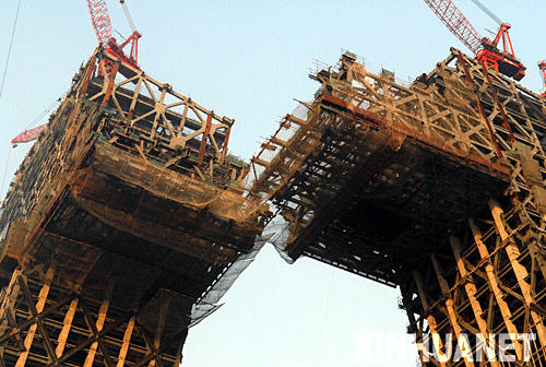 資料圖片:2007年11月28日,位于北京市東三環中央電視臺新址的兩座正在建設中的“斜塔”“握手”。 新華社發