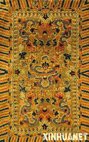這是展出的清乾隆“乾清宮”壁毯(11月18日攝)。 當(dāng)日,北京北緯拍賣公司舉行2008宮廷藝術(shù)品高峰論壇,預(yù)熱即將于12月6日舉行的秋季宮廷藝術(shù)品拍賣會(huì)。數(shù)十位海內(nèi)外收藏家、宮廷藝術(shù)品研究專家參加論壇,共賞宮廷藝術(shù)珍品。現(xiàn)場還展出七件清宮龍袍、明末銅鎏金龍鳳紋馬鞍、清康熙青花五彩十二月令花卉杯、清乾隆“乾清宮”壁毯等將在拍賣會(huì)上參與拍賣的一批宮廷藝術(shù)珍品,讓人大開眼界。 新華社記者徐亮攝