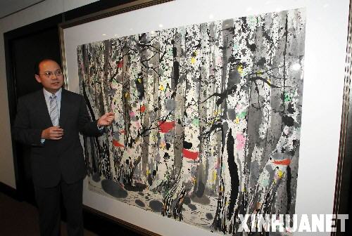11月18日,香港書畫專家介紹一幅估價(jià)約400至500萬港元的吳冠中作品《白樺林》。 當(dāng)日,一批將于12月2日在香港佳士得拍賣的部分中國古代及近現(xiàn)代書畫精品在香港展出。 新華社記者 張鳳國 攝