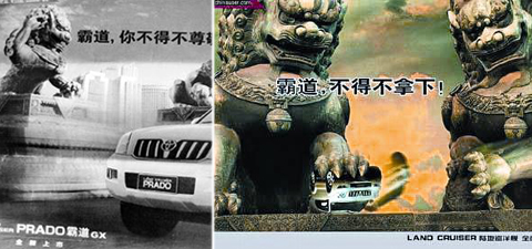 (左)包含中國傳統石獅子向奔馳的汽車抬起右爪做敬禮狀的豐田普拉多的廣告。(右)中國網民稱該廣告觸碰了中國人的自尊心,并制作了與之抗衡對的廣告,內容是石獅子用腳踩住普拉多的場面。