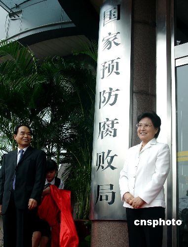 9月13日,備受關(guān)注的中國(guó)國(guó)家級(jí)預(yù)防腐敗的專門機(jī)構(gòu)——國(guó)家預(yù)防腐敗局正式掛牌成立。監(jiān)察部部長(zhǎng)馬馼(女)兼任國(guó)家預(yù)防腐敗局首任局長(zhǎng),屈萬祥兼任國(guó)家預(yù)防腐敗局副局長(zhǎng)。 中新社發(fā) 孫宇挺 攝