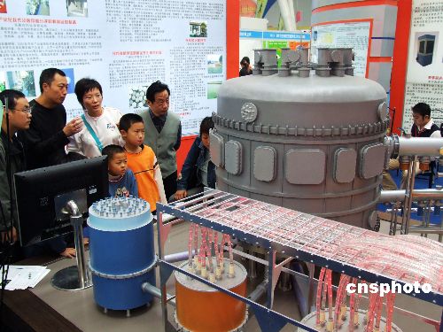2006年10月29日,在第六屆中國合肥高新技術項目——資本對接會布展現場,我國自主研制的世界第一個非圓截面全超導托卡馬克核聚變裝置EAST(俗稱“人造太陽”)模型吸引了不少市民和客商的眼球。據了解,該模型按1∶8的比例制作,可以直觀地看到“人造太陽” 的放電過程。 中新社發 葛宜年 攝