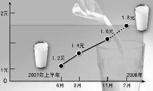 劉先生告訴記者,他家一直訂的衛崗天元奶,2007年上半年的時候還是1.2元一瓶,2007年8月份漲到了1.4元,11月又漲了2毛到1.6元,時隔2個月,又要從1.6元漲到1.8元,算起來,這半年里,連漲兩次,每次都漲2毛錢,漲幅已經遠遠超過10%!面對如此不斷的漲價,劉先生說自己得考慮是不是該少訂點了!