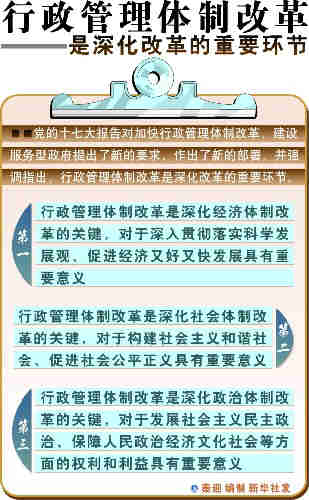 國務院總理溫家寶5日在政府工作報告中說,行政管理體制改革是深化改革的重要環節,是政治體制改革的重要內容,也是完善社會主義市場經濟體制的必然要求。