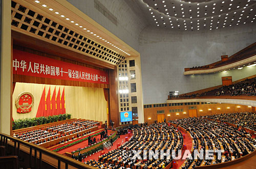 3月15日,十一屆全國(guó)人大一次會(huì)議在北京人民大會(huì)堂舉行第五次全體會(huì)議,這是大會(huì)會(huì)場(chǎng)。 新華社記者 楊宗友 攝