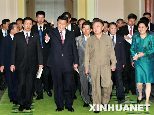 6月18日,朝鮮勞動黨總書記、國防委員會委員長金正日在平壤會見中共中央政治局常委、國家副主席習近平。這是雙方步入會見廳。 新華社記者 龐興雷 攝