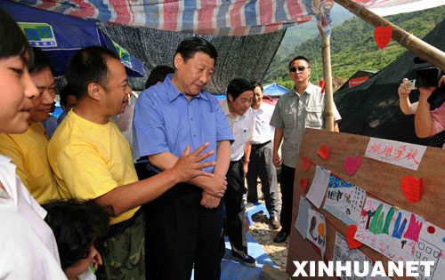 6月27日至29日,習近平和同行的中共中央政治局委員、中央書記處書記、中央組織部部長李源潮,在四川省委書記劉奇葆、省長蔣巨峰等陪同下,深入游仙、平武、北川、江油、都江堰、汶川等災區,看望慰問受災群眾、基層黨員干部、各方面救災人員和組工干部,調研黨建工作。在映秀鎮213國道搶通現場,習近平親切看望施工人員,鼓勵他們再接再厲,盡早打通這個交通生命線。在受災群眾安置點,他走進一個個帳篷和一間間活動板房,詳細詢問群眾吃飯、購物、就醫等方便不方便,還有什么困難。他說,妥善安置受災群眾是當前抗震救災工作的重中之重,一定要抓緊、抓實、抓細。習近平要求在受災群眾安置點,要盡可能搞好公共服務設施配套建設,千方百計方便群眾生產生活。當得知因災停課的學生大部分已恢復上課,習近平十分高興。在平武縣平通鎮臨時板房小學和北川縣桂溪鄉永利村小學,他向學生贈送課外讀物,勉勵小同學們從小好好學習,長大后用自己的勤勞和智慧為建設家鄉、建設祖國作貢獻。習近平強調,災后恢復重建是一項長期艱巨的任務,一定要把自力更生與對口支援結合起來,把政府主導與市場機制結合起來,充分調動各方面的積極性。在山東、廣東兩省對口援建活動板房工地,習近平看到中央對口支援的部署正在落實,感到很欣慰。他希望各支援省市進一步細化任務、落實責任、抓緊工作、確保質量,不辜負中央的重托,不辜負災區人民的期盼。