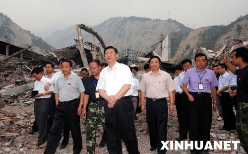 這是6月29日,習近平在汶川映秀鎮察看地震廢墟。 新華社記者 饒愛民 攝