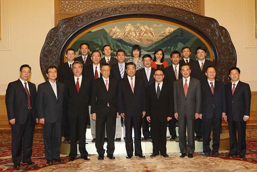 4月9日,中共中央政治局常委、全國(guó)政協(xié)主席賈慶林在北京人民大會(huì)堂會(huì)見(jiàn)王文杉率領(lǐng)的臺(tái)灣聯(lián)合報(bào)系訪問(wèn)團(tuán)一行。新華社記者 劉衛(wèi)兵 攝