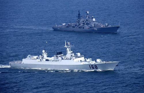 2005年8月23日,中俄海軍導彈驅逐艦在實施海上協同。參加“和平使命-2005”中俄聯合軍事演習的雙方海空軍部隊,經過數天高強度實兵對抗,23日在山東半島東南海域進行海上封鎖作戰演練。