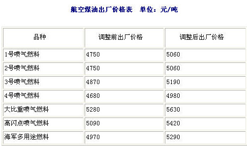 航空煤油出廠價格表 單位:元/噸(注:3號噴氣燃料航空煤油出廠價每噸由4870元上調至5190元,每噸上調320元)資料來源:新華網
