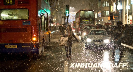 2009年12月21日,在英國(guó)倫敦,牛津街上的人們頂風(fēng)冒雪前行。歐洲大部分地區(qū)持續(xù)遭遇暴雪嚴(yán)寒天氣,截至21日已致死至少80人。新華社/法新 資料圖片