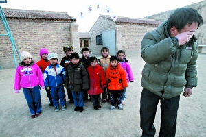 去年12月22日上午9點(diǎn),甘肅省渭源縣,代課老師蘇漢偉在和自己所帶的一年級10名學(xué)生照全家福時(shí)抹起了眼淚。他得知當(dāng)?shù)卣畬⒃?009年年底前清退完所有的代課老師。楊登峰 攝