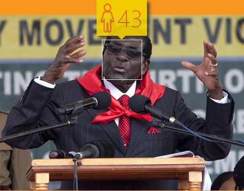 “顏齡”測試通過對照片上的瞳孔、眼角、鼻子等27個“面部地標點”展開分析,進而得出結論。研究人員說誤差難免。比如下面這幅照片:非洲最年長的國家元首和政府首腦——津巴布韋總統穆加貝今年2月28日慶祝自己91歲的生日,“顏齡”給出的分析是……