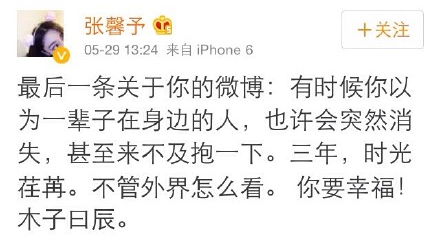 當然頭條不止是新人的,咱也不能忘了“舊人”,要不就成了喜新厭舊。就在“冰晨戀”公開后不久,李晨前女友張馨予趕來祝賀,“最后一條關于你的微博:有時候你以為一輩子在身邊的人,也許會突然消失,甚至來不及抱一下。三年,時光荏苒。不管外界怎么看。 你要幸福!木子曰辰!蹦銖倪@條微博中讀到了什么?牙尖妹好像聞到了濃濃的醋味兒。對于前任的祝福,網友并不買賬……“叫你作”、“情商感人,和曹格有的一拼”、“你是來搶頭條的嗎”……隔著屏幕,牙尖妹都能感受到網友深深的惡意。